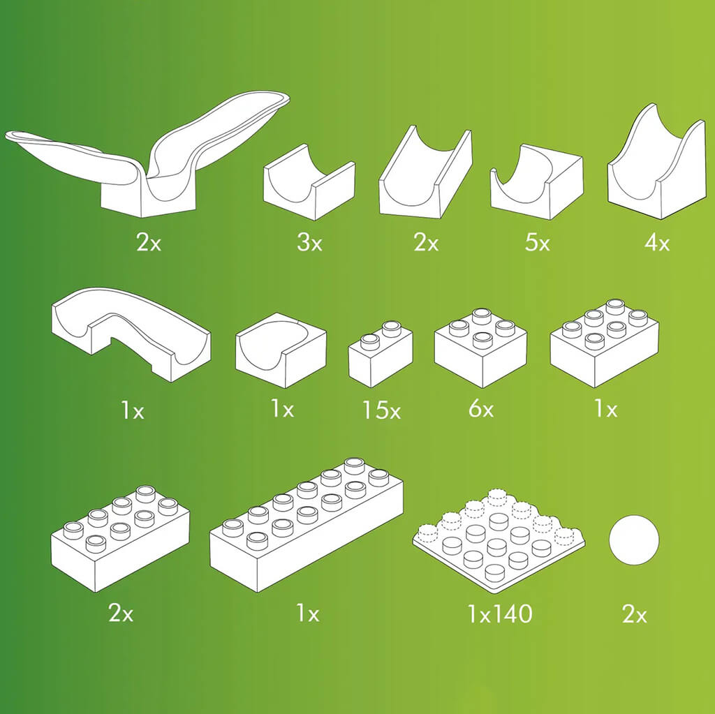 Contents: 46 pieces (16 run elements, 25 building blocks, 1 baseplate, 2 marbles and 2 cradle chutes).