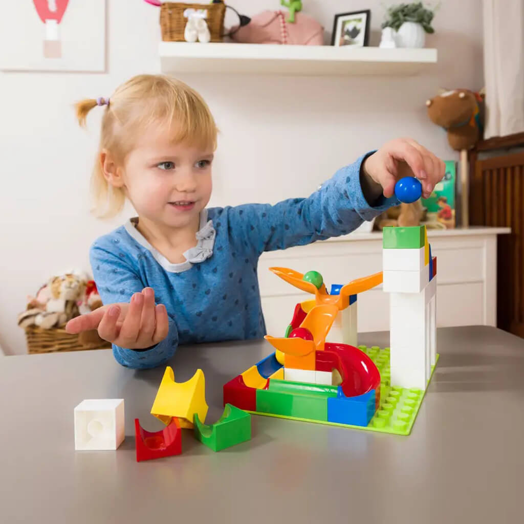 Hubelino modular and compatible marble runs are designed to stay put, so your kids can focus on the fun. They promote spatial intelligence and an understanding of fundamental physical concepts like acceleration and gravity. Whether with an instruction booklet or with free play, constructing a marble run stimulates working memory, and improves the capacity for analytical thought. And best of all, it builds on an existing system to extend its life.