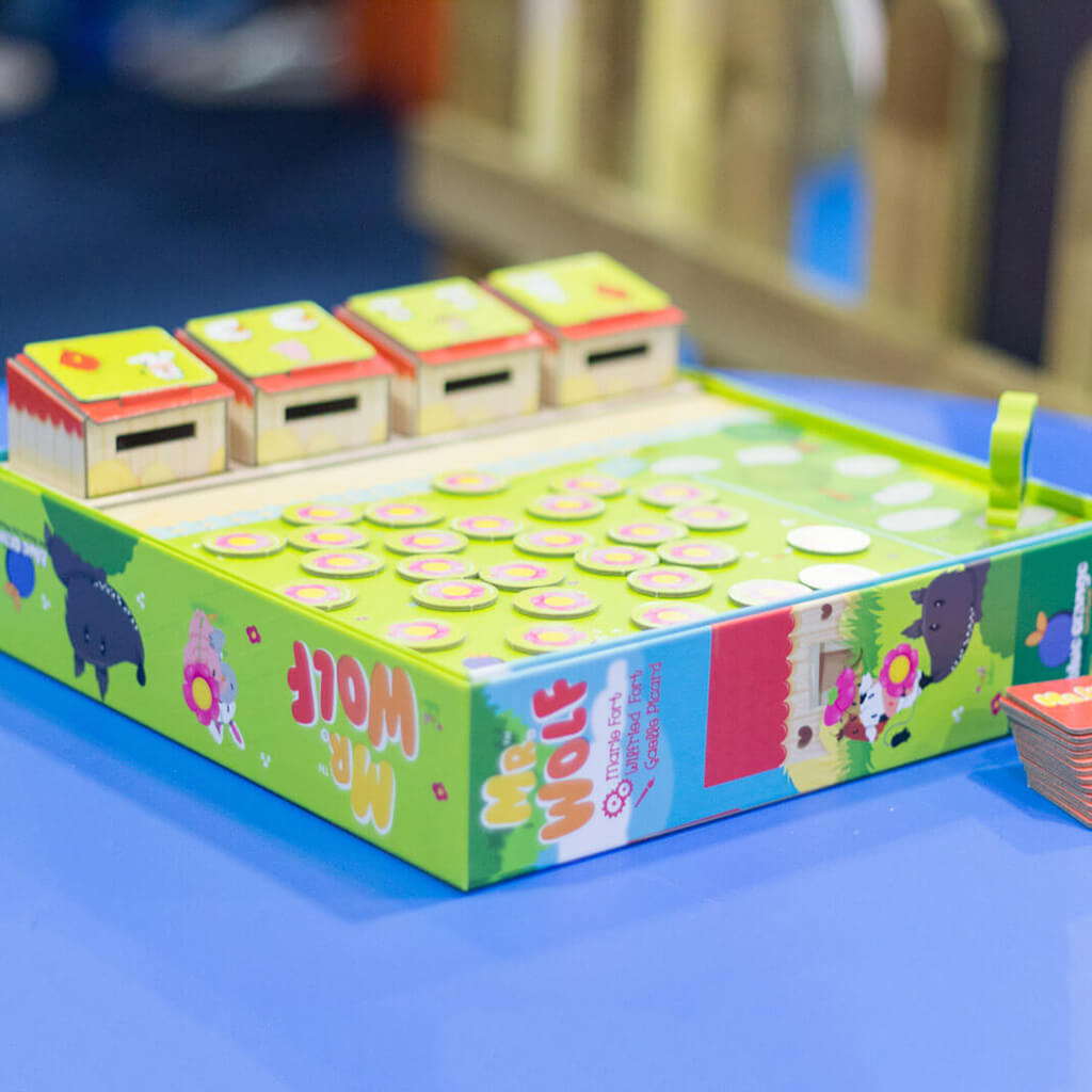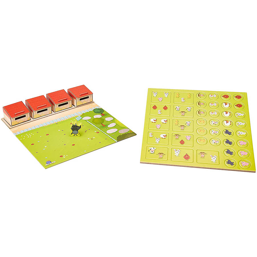 Mr. Wolf is a cooperative game where players work together to hide all the correct animals into the correct barns before Mr. Wolf reaches the field on the stone path.  It is a gentle and fun introduction to games for young children, who love posting the animal tokens in the correct barn, and helps strengthen memory and team-work.